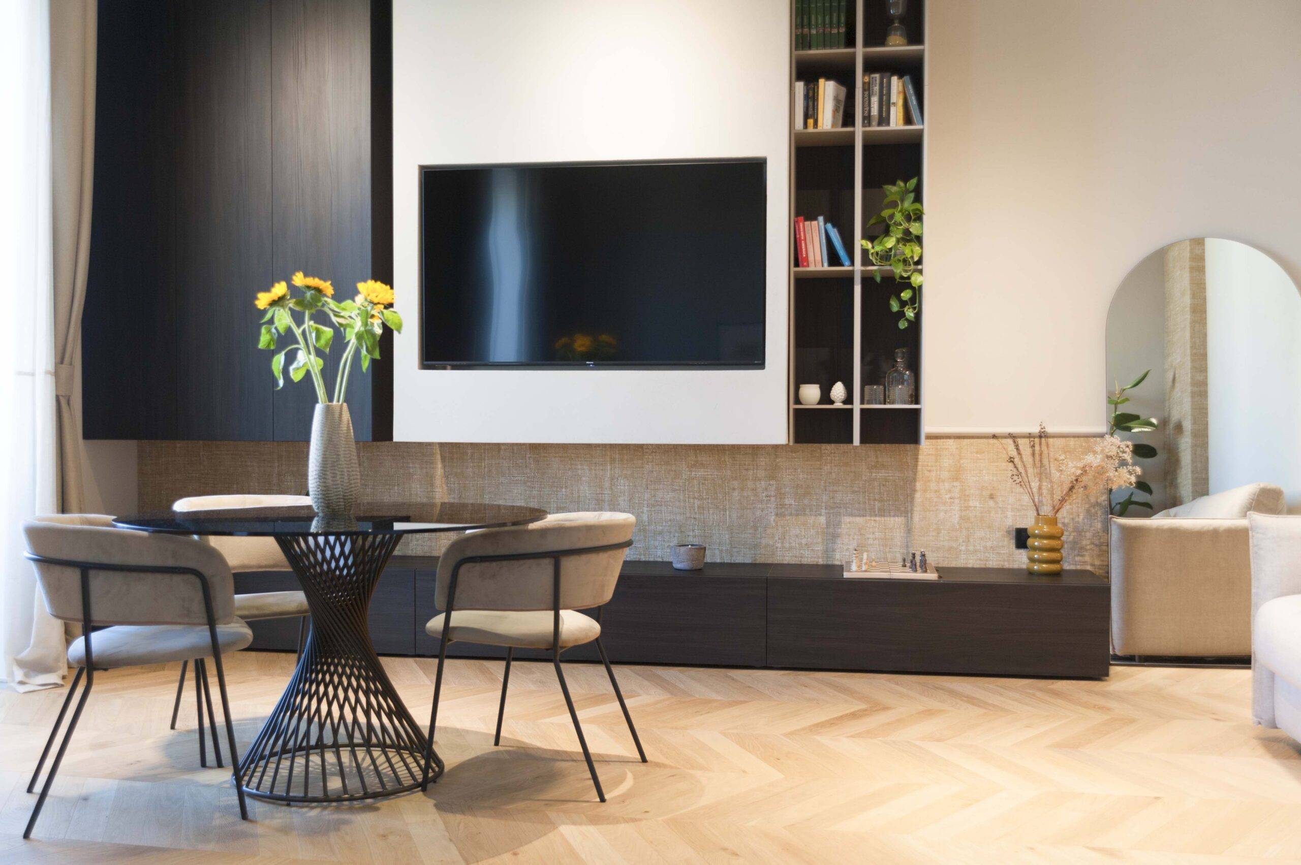 Gli interni, caratterizzati da ampi spazi luminosi e arredi di design, creano un’atmosfera calda e accogliente, ideale per il relax.